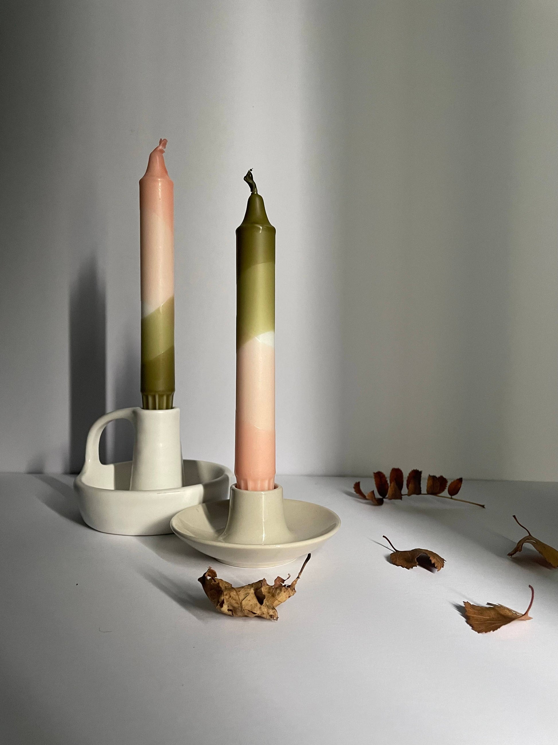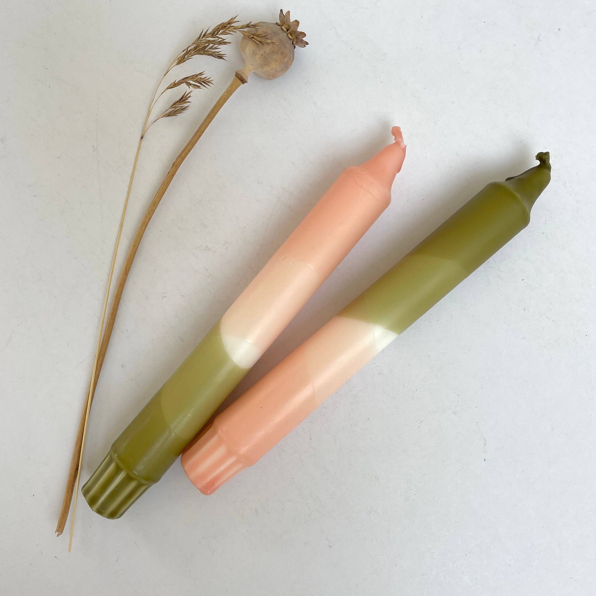 Get ready for some fabulous dinner parties with these unique, dip-dyed, blush pink and olive green dinner candles.